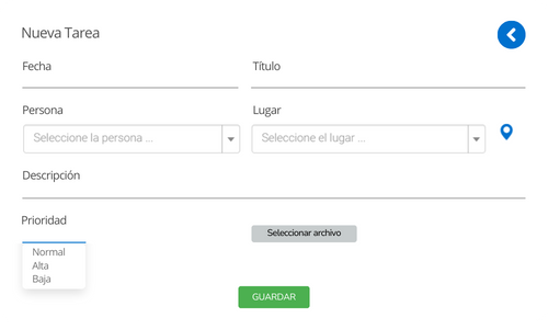La plataforma posibilita la creación de tareas, permitiéndote asignarlas a colaboradores. Asimismo, te brinda la opción de especificar la ubicación donde se llevará a cabo la actividad y establecer su nivel de prioridad (baja, media o alta). Además, tiene la posibilidad de añadir una descripción y adjuntar un archivo si es necesario.