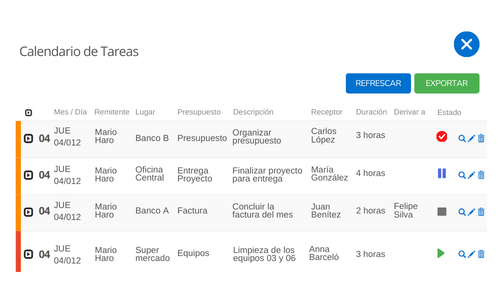 Para un control más efectivo, se muestra la duración de la actividad y su estado. En situaciones en las que la persona asignada no pueda cumplir con la tarea, tendrás la posibilidad de delegarla a otra persona.